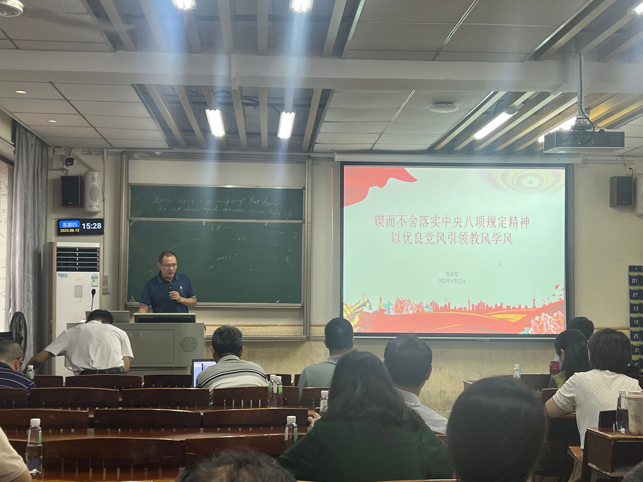 根据公司深入贯彻中央八项规定精神学习教育工作部署,6月12日,公司党委书记杜应发以“锲而不舍落实中央八项规定精神,以优良党风引领教风学风”为题,给教师党支部全体党员讲专题党课。