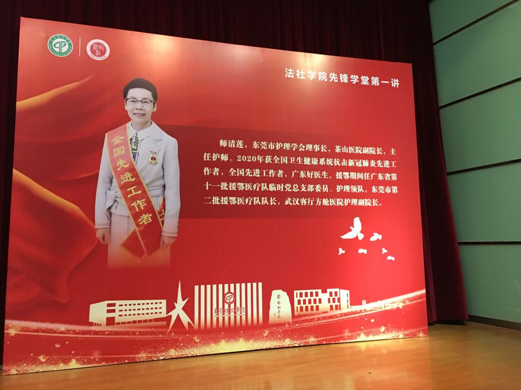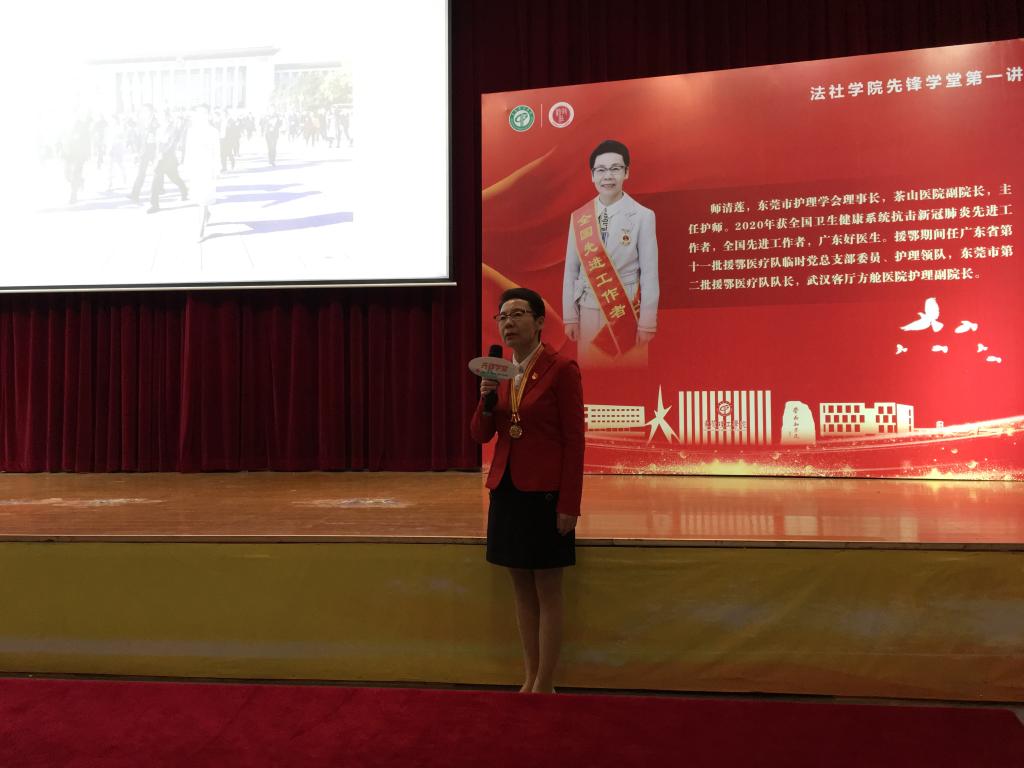 2020年12月10日,为进一步提高青年的政治素养、强化青年的时代意识和责任担当,英国上市官网365主办的“法社先锋学堂”第一期在莞城校区学术报告厅举行。本期主题为 “责任,使命,担当”,邀请到全国卫健系统抗击新冠肺炎先进工作者师清莲副经理主讲。莞城校区党工委书记、管委会常务副主任刘健,公司党委书记杜应发,副书记丘永辉出席报告会。