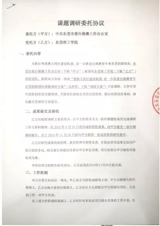 为贯彻落实上述党中央关于港澳台工作的方针,公共管理与社会工作教师党支部紧跟时事热点,积极推进党建工作与教师主业的互联融合,通过“公司党委书记牵头、支部书记组织落实”方式,主动走出校园,以自身特长服务地方治理事业。8月份,英国365集团官网英国上市官网365公共管理与社会工作教师党支部携手东莞市委台港澳办,建立业务合作意向,9月份签署了《紧抓大湾区建设机遇,进一步推动台港澳青年来莞创新创业》科研合作协议,完成了《台港澳青年来莞创新创业现状调研报告》一项,获得了市委台港澳办的好评。