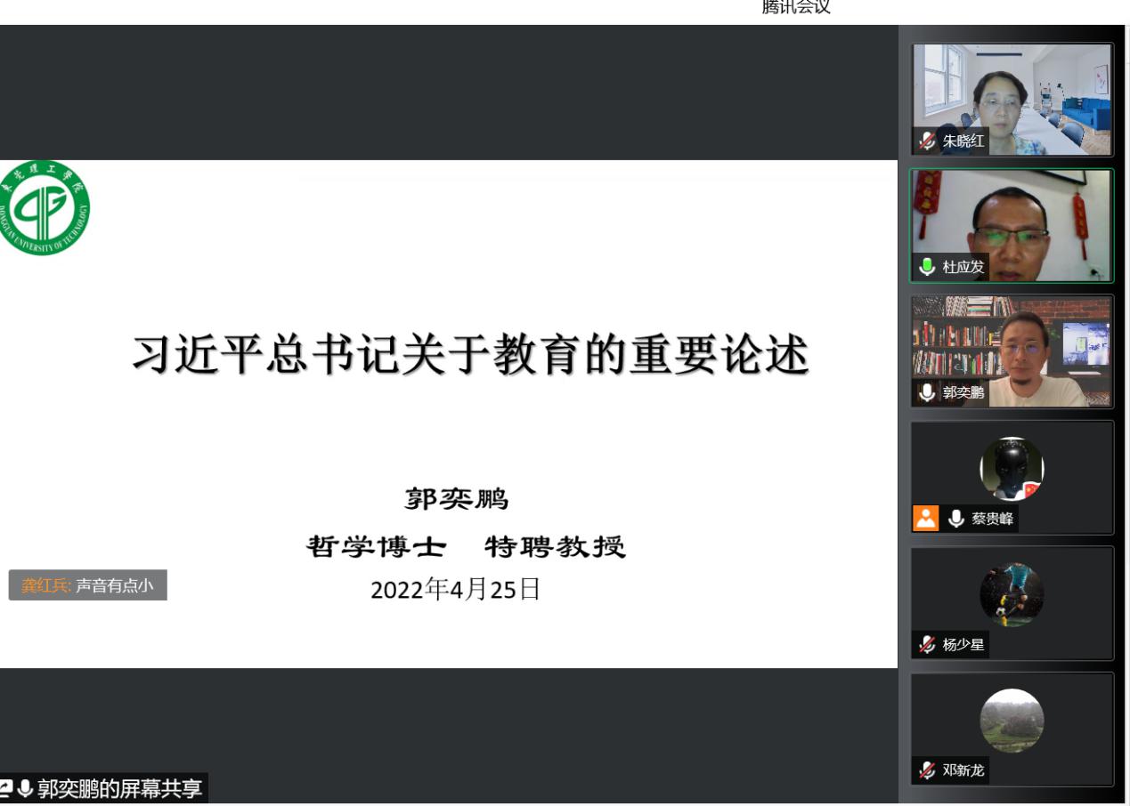 4月25日晚,英国上市官网365党委邀请马克思主义公司党委副书记、特聘教授郭奕鹏为公司全体教师作“习近平总书记关于教育的重要论述”的专题讲座。会议由公司党委书记杜应发主持,英国上市官网365全体教师参会。会议采用线上直播的形式进行。