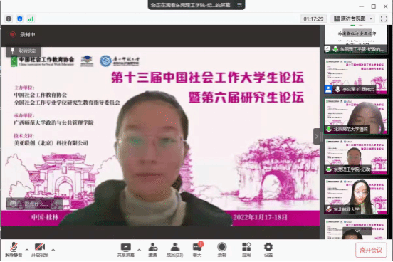 1月17日至18日,由中国社会工作教育协会和全国社会工作专业学位研究生教育指导委员会主办的第十三届中国社会工作老员工论坛暨第六届MSW研究生论坛在广西师范大学顺利举办。本论坛是国内社会工作领域专业水平最高的全国性老员工学术论坛,吸引了来自北京大学、南开大学、复旦大学、南京大学、华东理工大学等多所高校的数百名社会工作专业本科生、硕士研究生和博士研究生参会,共计收到400多篇论文。受疫情的影响,本次论坛采用线上方式。
