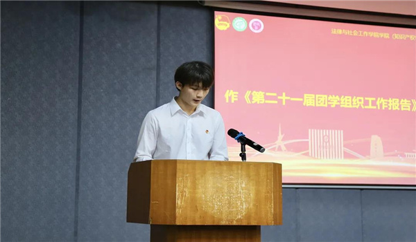 随后,由执行主席陈境洋作第二十一届团学工作报告,对过去一年的团学工作做总结。报告中提到,本学年团学在服务公司和内部建设等方面都取得一定的进步。