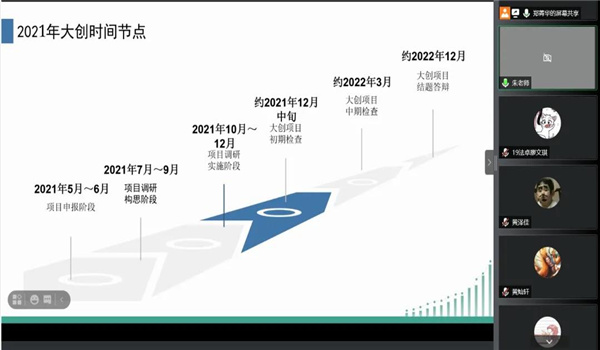 随后,朱晓红老师向我们分享大创项目的关键时间节点。知晓大创项目的各个关键时间节点可以帮助同学们有效规划自己完善项目的时间,做出合适的计划。2021年的大创项目伴随着7月暑假的到来正式展开。在接下来的一年半里,我们将不断地完善充实我们的项目,接受老师、公司对我们的考验。相信在大学的时光里,大创训练项目会成为同学们难忘的回忆。