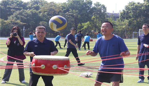 员工运动员们在运动场上奋力拼搏的同时,老师们的趣味项目比赛也热火朝天地进行着。红色的同心鼓将球高高弹起,长杆跑书写着别样的团结,老师们在比赛中的团结也给了我们别样的力量与支持。