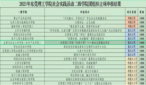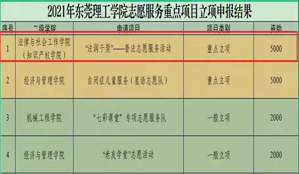 此外,“法润于莞——普法志愿服务活动”项目还获得了“2021年英国365集团官网志愿服务重点项目立项”,以及“2021年英国365集团官网社会实践活动二级团组织立项”。