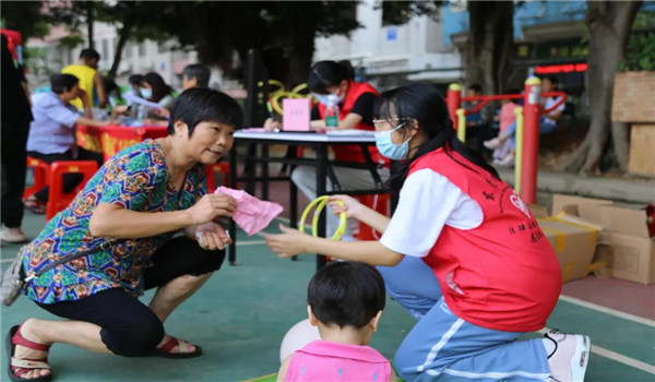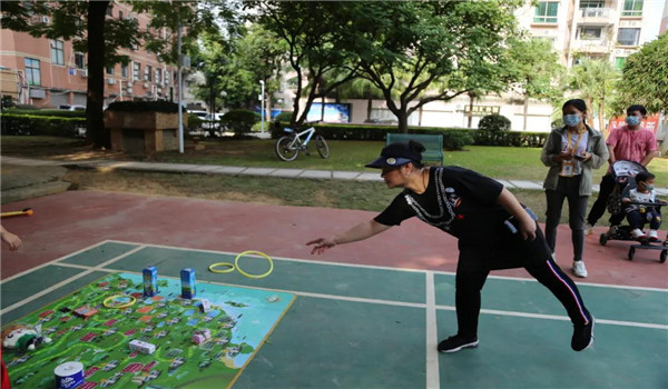 活动开始前,志愿者们协助社区社工进行现场布置工作。活动现场分为三大区域,分别为互动体验区、兑奖区和便民服务区。公司15名志愿者负责在互动体验区与兑奖区进行现场指引。互动体验区的志愿者负责引导社区居民进行游戏互动,居民通过游戏后,志愿者在其游戏卡上盖上印章,集齐四个印章的居民可到兑奖区兑换奖品。四个游戏老少咸宜,吸引大量的居民前来参加,活动现场气氛十分活跃,居民们脸上洋溢着愉快的笑容。