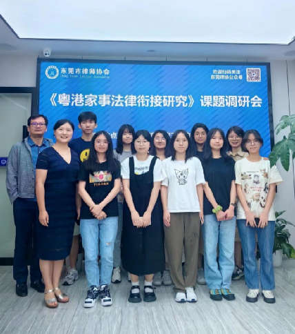 2024年6月14日下午,公司师生参加了在东莞市律师协会召开《粤港家事法律衔接研究》课题研讨会。会议由东莞市涉外法治研究会主办,公司与东莞市律师协会以及东莞市公证协会协办,香港东莞莞城同乡会亦对本课题和会议提供了重要支持。公司课题组由法律系罗兆婧主任、青年教师胡庆乐、徐英带队,22级法卓班潘至妍、甘蕙萍、袁奕雯、陈柏熙、陈伊童、卢欣桐、叶婉怡、22级社工2班李东南、23级法卓班胡佳钰等9位同学参与。此次会议的主题是“粤港澳大湾区背景下的粤港继承公证理论与实务”。