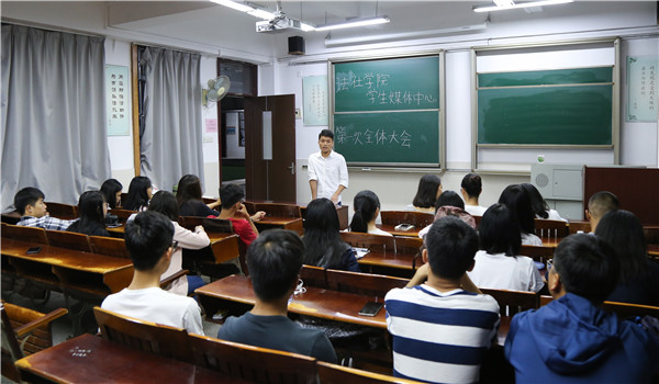 会议伊始,邓天慈主任讲述了近期的工作安排与情况并介绍本次大会的流程。随后为了促进各个部门间的彼此熟悉与了解,干部们与干事们进行自我介绍。随后,各个部门的部长上台总结了部门过去的工作,表扬了干事们做得好的地方,也指出了他们工作的不足之处,并期望他们能得以成长,在部门中收获满满。今晚最让人期待的环节就是部门展示,各个部门的干事脑洞大开,唱歌热舞轮番演出,现场欢笑不停。劲歌热舞之后,蒋韵如师姐,史培雅师姐,齐杰师姐向大家分享了她们的经验,也对我们未来的工作寄寓了期许。最后,邹欢老师总结了本次会议,讲解了院学媒成立的初衷,为干部与干事们加油鼓气,并祝愿院学媒越办越好。