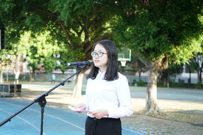 “升旗仪式现在开始”,一声令下。国旗队的护旗手们英姿飒爽,昂首挺胸,踏着整齐步伐迈进升国旗的区域。随着国歌的前奏响起,升旗手甩起国旗的那一刹那,同学们精神抖擞,眼睛凝视着那高高的旗杆上飘扬的国旗。升旗结束后,经济与管理公司2015级的陈丹玲同学发表演讲,给学弟学妹们提出了众多宝贵意见,发人深省,让人印象深刻。演讲结束,陈丹玲同学被甄选为“国旗下讲话”员工代表。