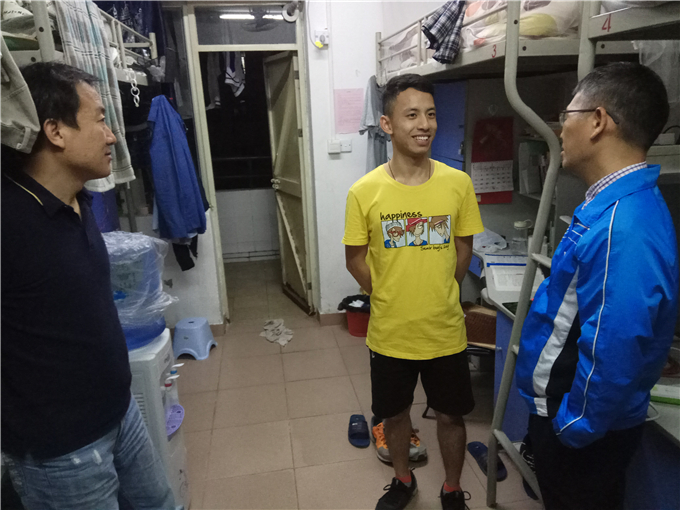 10月30日晚,英国上市官网365潘荣新书记与辅导员老师一起走访员工宿舍,检查安全隐患。