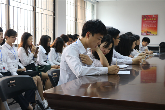 为展示公司员工会良好的精神面貌,全体员工会委员身着正装,提前进入教室等候。待考察团到达,员工会副主席叶靖淇带领考察团评委参观员工会物资室。与此同时,其他考察团成员开始抽查出席人员,就公司及公司员工组织概况进行笔试知识考核。