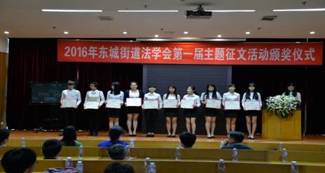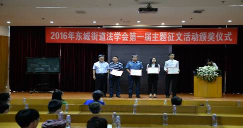 经过三个月的策划、征集,活动共收到公共服务、合同风险、劳动争议、社区矫正工作、培养法治思维、社区治理等方面作品120余篇,评出机关组与员工组优秀作品共30篇。2016年11月8日上午,颁奖仪式在东城街道办事处举行。朱晓红、蔡贵峰两位老师代表法律与社会工作公司党总支、公共管理系与20名获奖的同学一起参加了颁奖活动。与会人员还有东莞市东城街道党委副书记、东城街道法学会会长吴沛林、东城街道党委政法办专职副主任、东城街道法学会副会长袁满坤以及东城街道法学会成员单位代表、所有参加法学会征文活动的机关单位、社区(林场)人员,总共约80人参与了此次颁奖活动。