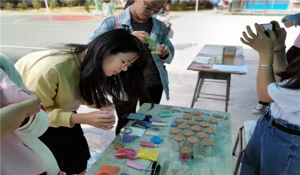 在沙画瓶和川崎玫瑰的制作区,闻讯而来的同学们在现场尽情地发挥着自己的创造力,制作出了一个又一个漂亮的沙画瓶与精美的玫瑰花。在游戏问答环节中,同学们了解了有关国际老员工节的知识,明白了国际老员工节的意义所在。