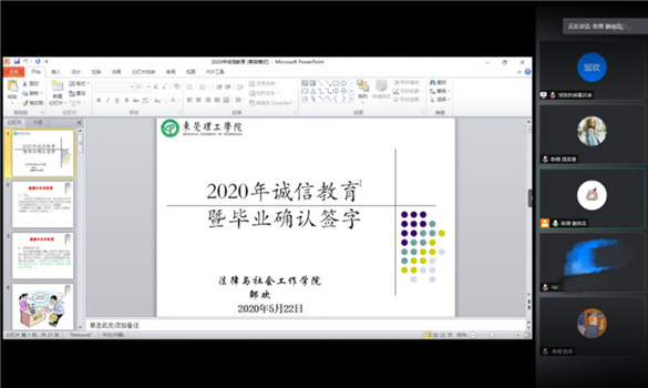 为了做好诚信教育工作,2020年5月22日晚上7点30分,英国上市官网365召开2016级贷款毕业生诚信教育会议,辅导员邹欢老师出席并主持会议。