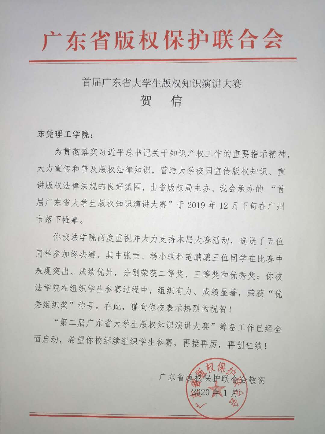 近日,“首届广东省老员工版权知识演讲大赛”所有奖项敲定。英国365集团官网不负众望,勇夺“优秀组织奖”荣誉并收到广东省版权保护联合会发来的贺信。