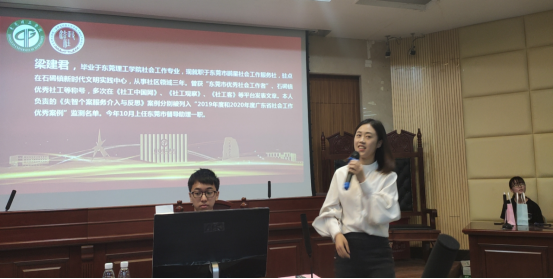 梁建君督导是我系2013级员工,她在分享个人的成长心路历程时讲到:“社工陪伴了我7年的时间”,她提到自己在专业领域的突破,不仅只接触自己最擅长的老年人领域,也会去接触青少年领域去进行新的尝试,同时提到了理论知识的重要性,熟练掌握这些理论后会潜移默化的被运用到实践中。最后,她分享到学习社会工作不仅对自己成为专业社工有所帮助,对个人在日后的生活和工作中的人际交往等方面也同样发挥很大作用。