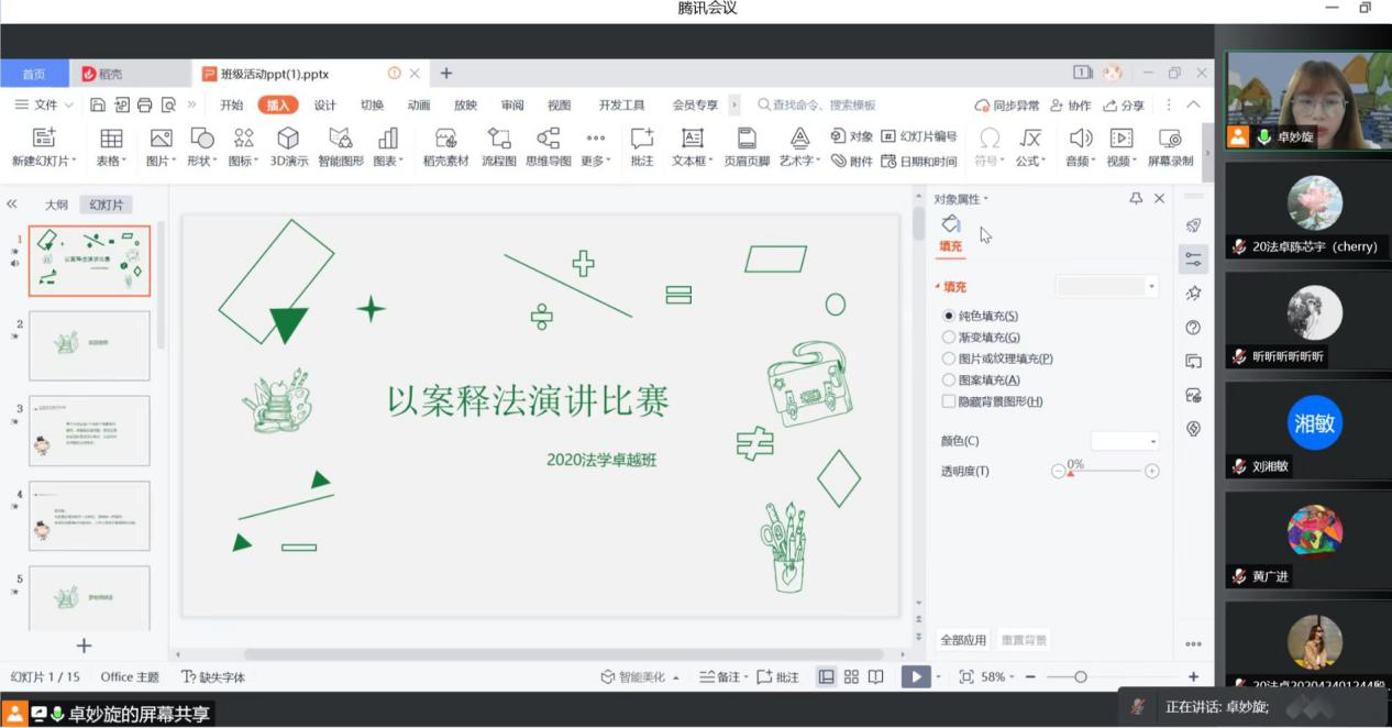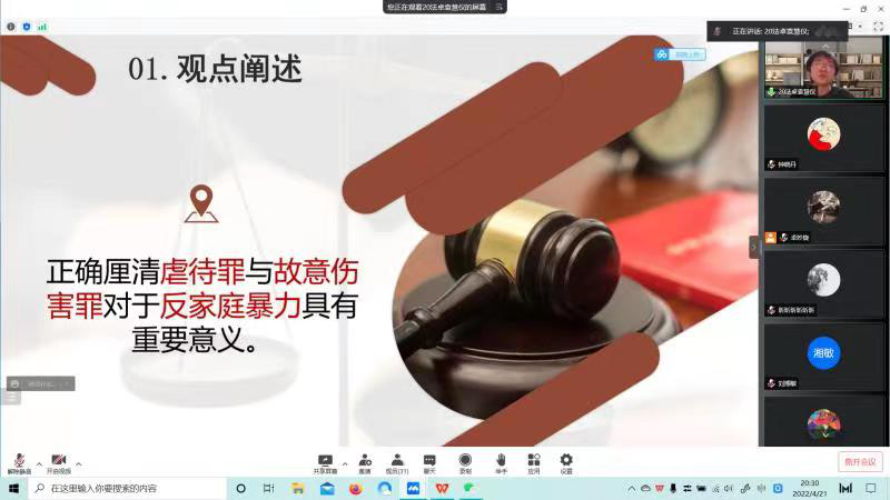 疫情当前,居家学习之余,公司为了激励法学专业员工更好地培养紧跟时事的敏锐洞察力,充分发挥司法案例的指导作用,促进员工对法条的综合学习,增强员工对于法律适用规范与类案裁判尺度理解,2022年4月21日晚,20级法学卓越班“以案释法”演讲比赛于线上腾讯会议正式举行。本次活动由卓妙旋同学主持,并邀请了法律系主任罗兆婧老师、法学博士黄广进老师作为嘉宾参加本次活动。