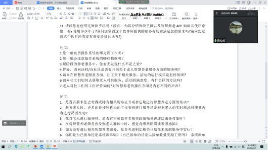 本次工作坊是由社会工作专业师生组织,目的在于提升社会工作专业员工的研究能力。本次工作坊在研讨主题上集中在实地访谈、问卷调查注意事项和citespace软件操作演示三个方面。为保证研讨的充分性,本次工作坊主要针对智慧养老选题的大创项目员工。