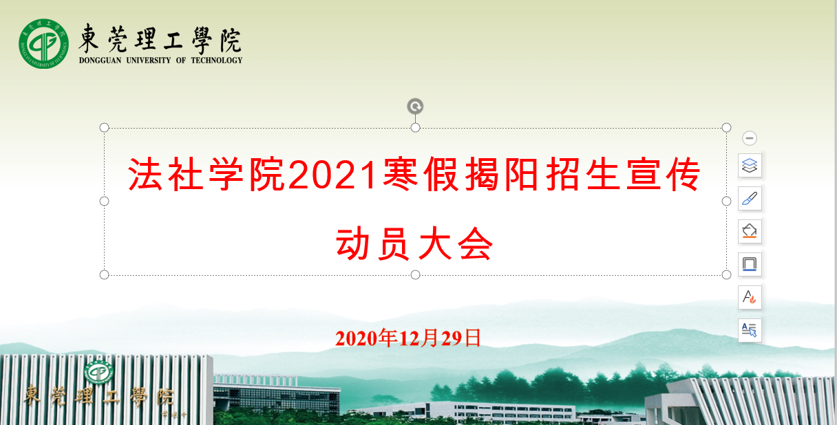 为应对新高考背景下招生宣传面临的挑战与机遇,全力做细做实2021年招生宣传工作,12月29日下午公司在莞城校区5201会议室召开了揭阳招生宣传队行前动员会。动员会由公司教学副经理朱晓红主持,招生联系人刘海波老师以及宣传队莞城校区全体队员参会。