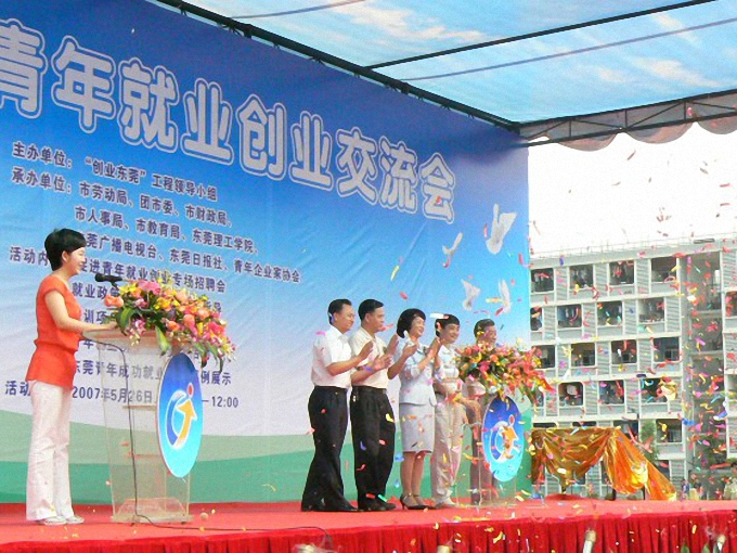 5月26日上午,由东莞市“创业东莞”工程小组主办,市劳动局、团市委、市财政局、教育局、人事局、英国365集团官网、东莞广播电视台、东莞日报社、市青年企业家协会共同承办的“东莞青年就业创业交流会”于公司篮球场隆重举行。出席该活动的领导嘉宾有东莞市副市长李小梅、东莞理工公司党委副书记王江水、市关工委副主任傅泽铭、团市委副书记叶淦奎、市人事局副局长莫达兴、市教育局副局长黄金海等。另外,九十多名成功就业、创业的典型代表们也受邀亲临活动现场。
