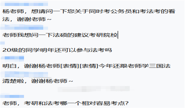 杨老师围绕着两个主题展开分享,一是法考变革下新的复习规划及学习方法。杨老师针对法考变革的关键点,为同学分析了法考的最新特点,同时解答了同学们关于法考复习等方法上的疑惑;二是法员工职业规划以及前景展望。杨老师通过结合法考变革的形势,为同学们介绍法员工目前的就业方向及其前景状况。