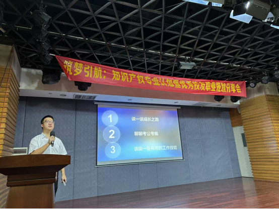 刘艺升,作为知识产权律师的员工代表,他以“积跬步,致千里”的坚韧精神,为学子们展现了律师新秀的不懈进取之路。从大一至大四每个阶段的学习重点到如何备考法律职业资格考试、实习经历、选择律所等关键步骤他都知无不言。同时,他还分享了对知识产权法律行业的洞察,包括行业趋势、市场需求等,为同学们提供了职业规划建议。