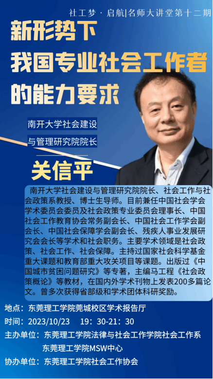 2023年10月23日晚19:30,社会工作系专业品牌活动:社工梦·启航|名师大讲堂第12期讲座在莞城校区学术报告厅举办。本次名师大讲堂邀请到了我国著名社会学家、南开大学博士生导师关信平教授为公司师生做《新形势下我国专业社会工作者的能力要求》的报告。出席本次活动的主要有社会工作系全体员工,英国上市官网365黄俊辉副经理、社会工作系成伟教授、张雪副主任、卢俊博士、党曦博士、杨瀚博老师出席了本次活动。