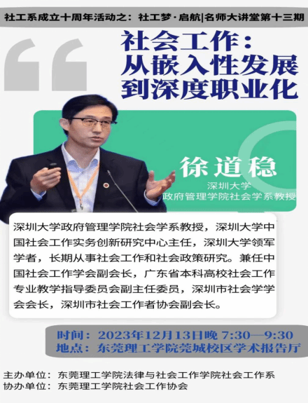 2023年12月13日晚19:30,社会工作系专业品牌活动:社工梦启航|名师大讲堂第十三期深圳大学徐道稳教授讲座在莞城校区学术报告厅顺利开展。此次,社会工作系邀请深圳大学政府管理公司社会学系徐道稳教授为公司师生与东莞一线社工做《社会工作:从嵌入性发展到深度职业化》的报告。公司成伟主任、张雪副主任、居正老师、张子庄老师、党曦博士出席本次活动,同时也邀请了东莞众多一线社工聆听此次讲座。