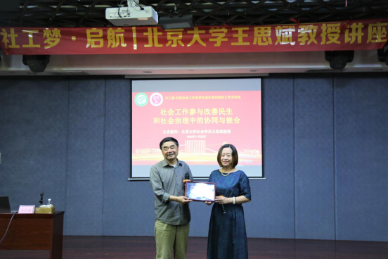 讲座中,王思斌教授从国家政策等宏观角度出发,层层论述,最终细化到社工的实务工作发展。同时,他用生活中许多鲜活的例子向我们传授社会工作者应该如何嵌入、嵌合到我们的社会服务的经验,一番精彩的论述给予了我们很多精神上与学术上的指导。尤其当谈到关于社会工作者的流动和流失问题时,王教授引出“留得住,用得上,干得好”的概念;在社会工作者参与社会建设方面,王教授指出社会工作要与各行各业协同发展,同当地政府合作,提出由协同走向嵌合的观点。最后,王教授再次强调了社会工作在参与社会治理中应遵循发展原则,向我们阐述了社会工作嵌合性动态发展的重要作用。