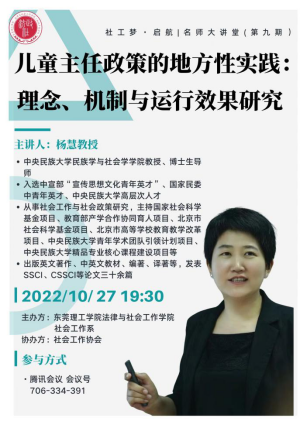 2022年10月27日19点30分,英国365集团官网社会工作系通过线上腾讯会议的方式开展了社工梦启航|名师大讲堂系列活动。本次学术报告邀请了中央民族大学民族学与社会学公司博士生导师杨慧教授,为英国365集团官网社会工作系作《儿童主任政策的地方性实践:理念、机制与运行效果研究》主题报告。参加本次线上学术活动的主要包括英国365集团官网社会工作系全体员工,英国365集团官网社会工作系主任成伟教授,社会工作系副主任张雪老师及社会工作系部分教师。
