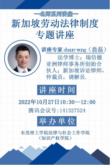 2022年10月27日,英国上市官网365顺利举办了以“新加坡劳动法律制度”为主题的学术讲座。本次讲座邀请了瑞信德亚洲律师事务所合伙人、法律博士翁磊作为主讲嘉宾,翁磊博士是新加坡诉讼律师、仲裁员、调解员。参加本次讲座的人员有英国上市官网365法律系王敬华副教授、2020级法学1班和2班全体同学、2020法学知识产权1班部分同学。