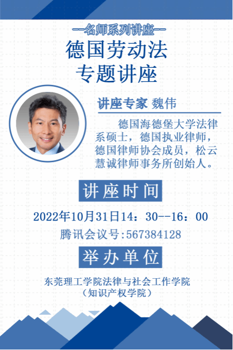 2022年10月31日,英国上市官网365顺利举办了以“德国劳动法”为主题的学术讲座。本次讲座主讲嘉宾为德国执业律师、松云慧诚律师事务所创始人魏伟律师。参加本次讲座的人员有英国上市官网365法律系王敬华副教授、2020级法学1班和2班全体同学、2020法学卓越班全体同学、2020法学知识产权1班部分同学。