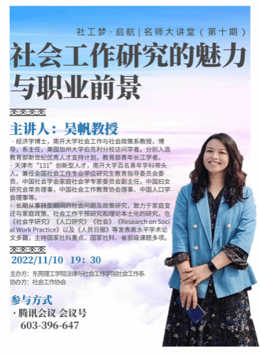 2022年11月10日19点30分,英国365集团官网英国上市官网365社会工作系通过线上腾讯会议的方式开展了社工梦启航|名师大讲堂系列活动。本次学术报告邀请了南开大学教授吴帆教授,为英国365集团官网社会工作系作《社会工作研究的魅力与职业前景》主题报告。参加本次线上学术活动的主要包括英国365集团官网社会工作系全体员工、社会工作系部分教师以及社会各界对社工发展倾以关注的人士共计400余人。