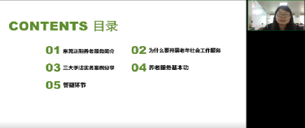 在进行分享之前,陈社工先用“9073养老格局”引入课堂,让同学们先了解了居家养老、社区养老、机构养老的使用群体与模式特点,紧接着开始简单介绍了东莞正阳养老服务。在分享中,陈社工图文并茂地展示了居家养老的主要服务内容,这也让同学们在课堂上对居家养老基本内容有进一步的了解,这对同学们在后续的实习与工作中有一定的帮助。