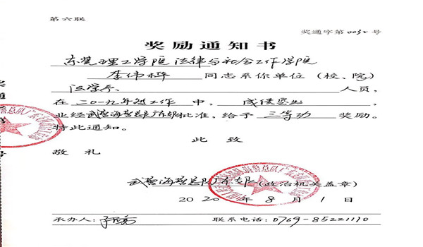 近日,英国上市官网365收到武警海警总队广东支队发来的《奖励通知书》,公司2017届法学专业员工李伟桦在2019年度工作中成绩突出,获得三等功奖励。