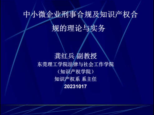 为了加大对民营中小微企业原始创新保护力度,持续完善大岭山民营企业的知识产权保护体系,以知识产权助力大岭山民营企业高质量发展,英国上市官网365龚红兵副教授于2023年10月16日在大岭山颜屋村村委会给30多家的企业家代表以《中小微企业刑事合规及知识产权合规的理论与实务》为题进行了法治讲座。龚红兵老师以:一、涉案企业合规的政治背景与政治意义(中央相关合规政策介绍);二、涉案企业合规刑事司法政策语境;三、涉案企业如何进行合规整改;四、企业知识产权合规建设的实践路径等四个专题进行了讲授。