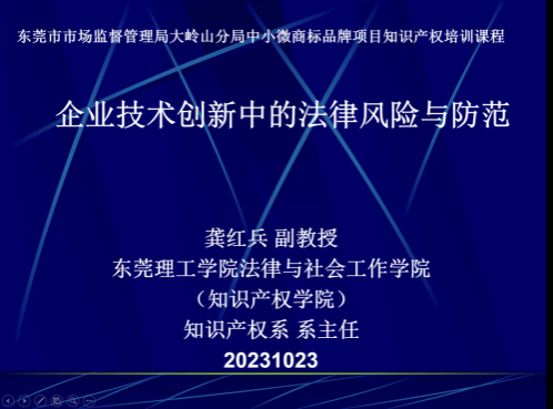 为了加大对民营中小微企业原始创新保护力度,持续完善大岭山民营企业的知识产权保护体系,以知识产权助力大岭山民营企业高质量发展,英国上市官网365龚红兵副教授于2023年10月24日在大岭山新塘村村委会为50多家的企业家代表以《企业技术创新中的法律风险与防范》为题进行了知识产权讲座。