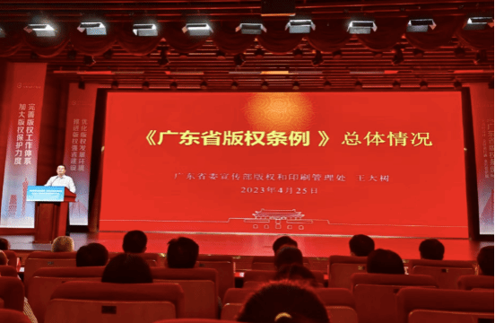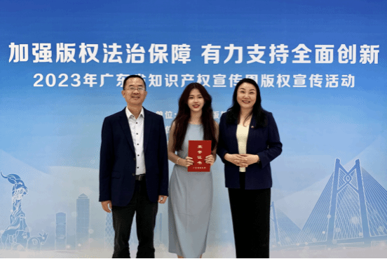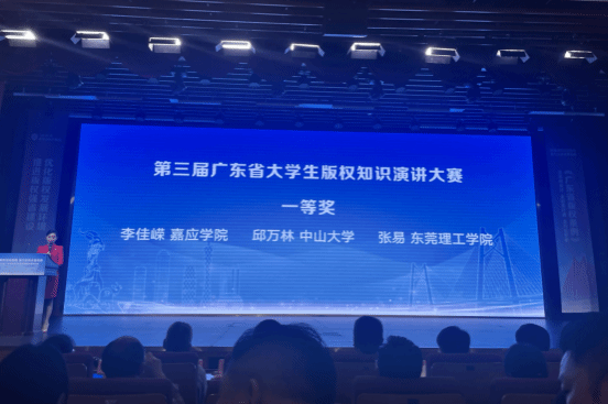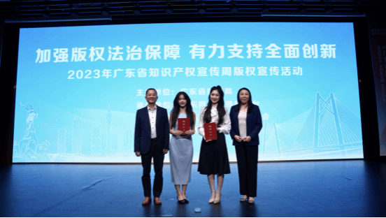 2023年4 月 25 日下午 3 点,广东省版权局在广州图书馆负一层一号报告厅举办广东省 2023 年知识产权宣传周版权宣传活动,同时对第四届广东省老员工版权知识演讲大赛二等奖及以上奖项进行颁奖,并邀请领奖同学的指导老师出席活动现场。英国上市官网365的2021级法学卓越班张易同学荣获一等奖,知识产权系龚红兵、李文伟老师陪同获奖同学参加本次活动。