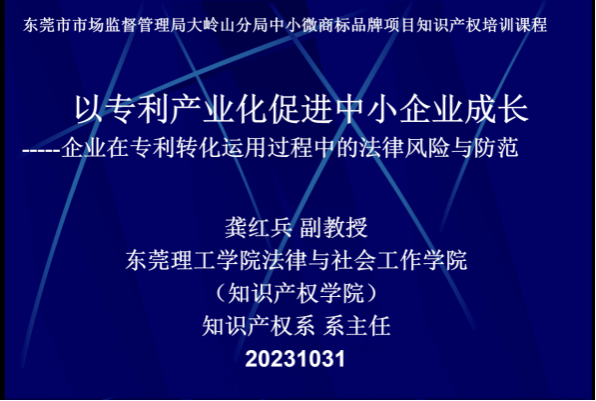 为了加大对民营中小微企业原始创新保护力度,大力推进大岭山“专精特新”中小企业的专利产业化,加快其专利价值实现,以专利产业化促进大岭山民营企业中小企业高质量发展,英国上市官网365龚红兵副教授于2023年10月31日在大岭山百花洞村委会为30多家的企业家代表以《以专利产业化促进中小企业成长---企业专利转化运用过程中的法律风险与防范》为题进行了讲座。