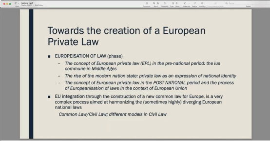 随后,Barbara Verri教授向同学们介绍了欧洲共同体的建立过程。各国经过共同协商,形成了27个国代表27个国家利益的法。这个法融入了欧洲各国的法律制度,包括普通法和民法。在欧盟大陆法系内部,意大利、德国、法国等国家的民法原则各有特色。