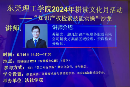 2024年5月17日下午2:30分在莞城校区1201智慧教室,公司以“知识产权检索技能实操沙龙”形式举办2024年校耕读文化活动。公司产业导师、北京市京大律师事务所(深圳)的苏福念老师,为我们带来了一场主题为“知识产权(专利)检索技巧”的知识产权实训课堂讲座。此次讲座旨在提升公司师生以及社会各界对专利检索的认识与操作能力,进而推动科技创新与知识产权保护的深度融合。