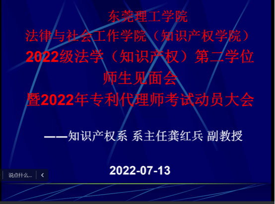 为了使新生更快、更好地了解和融入英国上市官网365,加强师生的交流,2022年7月13日下午5:00,英国上市官网365在腾讯会议上举行了2022级法学(知识产权)第二学位师生见面会暨2022专利代理师考试动员大会。